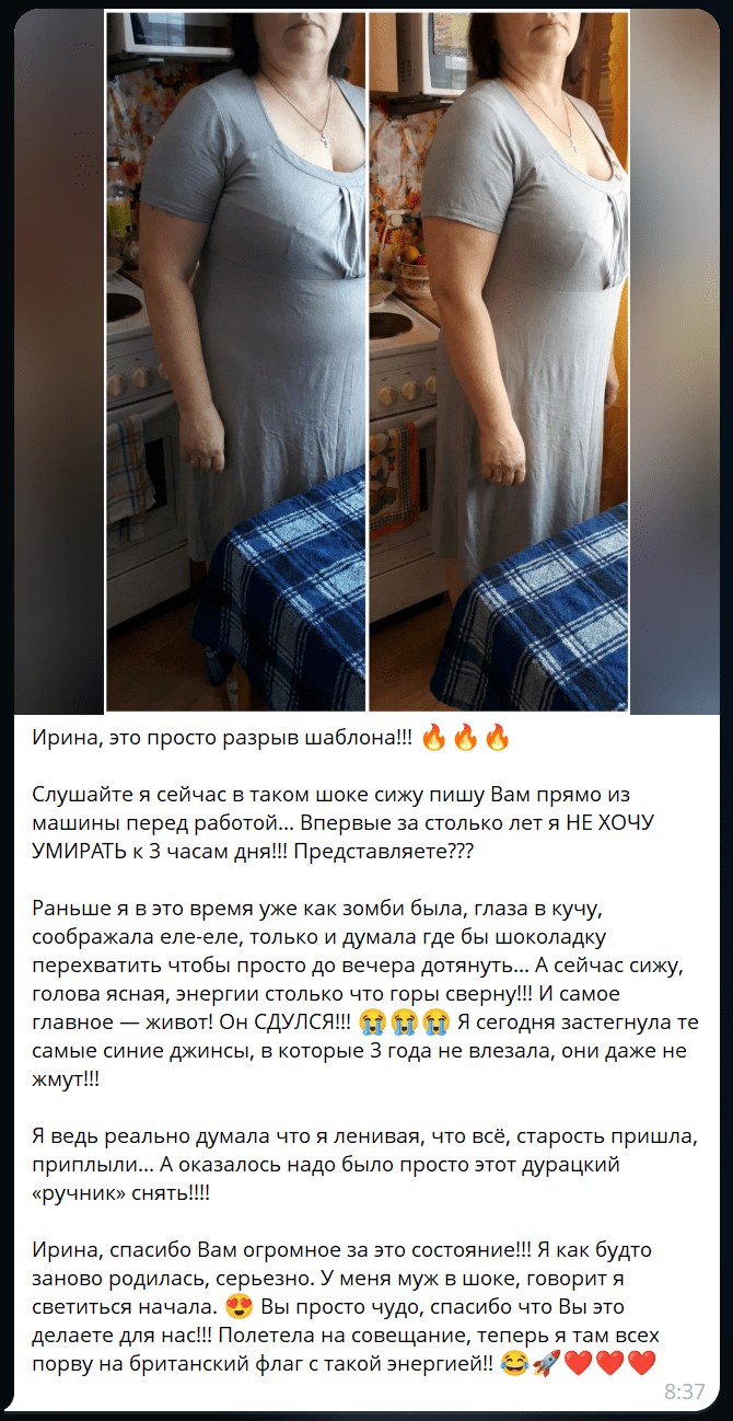 Почему так дёшево? Честно? Я хочу, чтобы Вы попробовали мой метод. Я знаю: когда Вы увидите первый результат (ушедший отёк, энергию), Вы захотите пойти со мной дальше, в большую программу восстановления. Но сначала – давайте просто снимем тело с ручника.