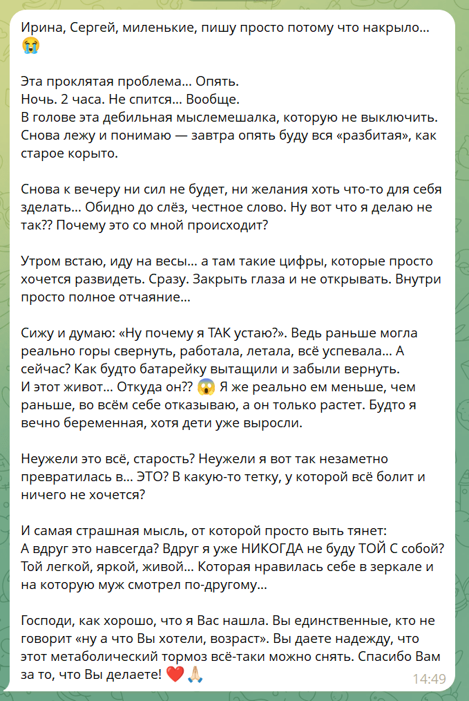 “У меня климакс. Врачи сказали: ‘Смиритесь, это возраст’. Ирина сказала: ‘Нет’. За 6 недель минус 7 кг, энергия вернулась, приливы стали реже. Я не верила, что это возможно”.